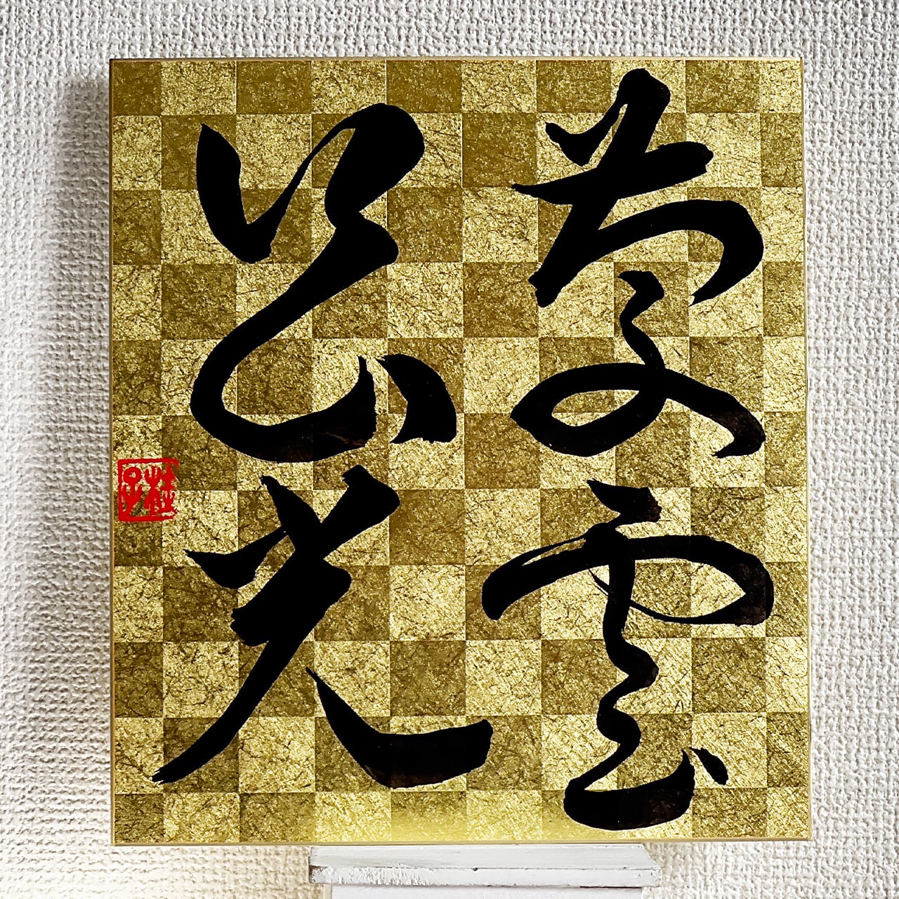 This piece is written in flowing sōsho (cursive script) on a traditional shikishi—a square decorative paperboard often used for calligraphy and poetry.